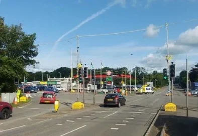 The works are at a busy junction linking the A4119 and B4595, key routes to the M4. Nearby are residential areas, local businesses, a petrol station, a DVSA test centre, and a 24-hour VOSA facility for commercial vehicle inspections.